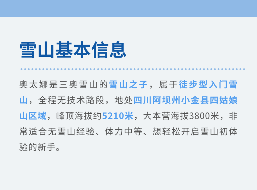 Day3:打尖包营地→奥太娜峰顶(海拔5210米),凌晨4点出发,徒步约4-5小时,登顶后拍照留念,随后下撤至四姑娘山镇,结束行程。