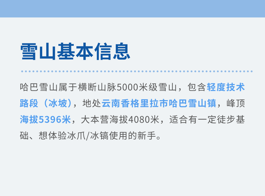 Day4:大本营→哈巴雪山峰顶(海拔5396米),凌晨2点出发,冲顶途中挑战冰坡,登顶后下撤至哈巴村结束行程。