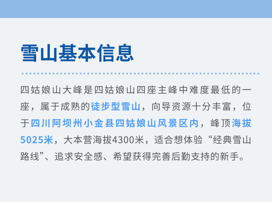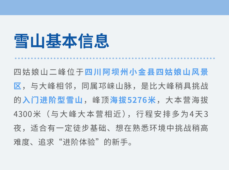 Day1:成都集合→乘车前往四姑娘山镇(海拔3200米),入住酒店,适应低海拔,晚上学习高海拔攀登注意事项;