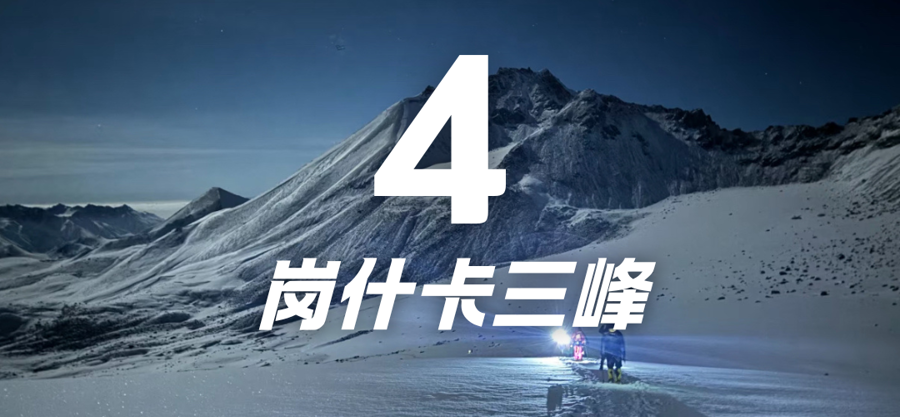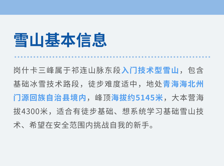 Day3:大本营→岗什卡三峰峰顶(海拔5145米),凌晨4点出发,冲顶途中实操冰雪路段技术,徒步约4小时登顶,随后下撤至门源回族自治县,返回西宁结束行程。