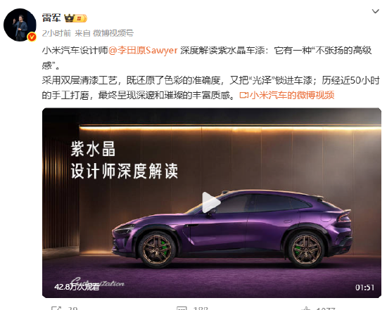 雷军今日转发小米汽车设计师田原对紫水晶车漆的解读称,有一种“不张扬的高级感”。其采用双层清漆工艺,既还原了色彩的准确度,又把“光泽”锁进车漆,历经近50小时的手工打磨,最终呈现深邃和璀璨的丰富质感。