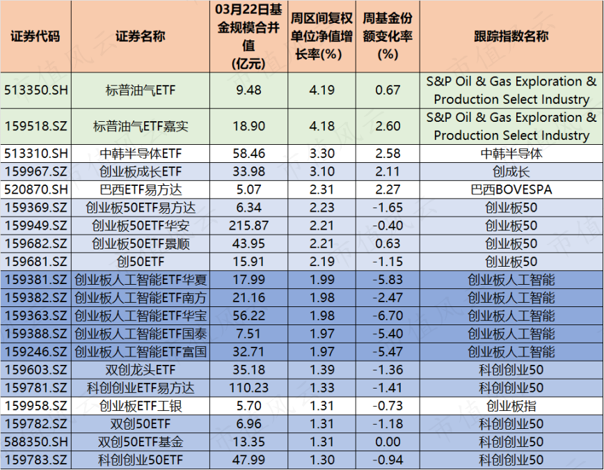 中韩半导体ETF上涨3.30%,创业板成长ETF上涨3.10%。此外,包括创业板50ETF、创50ETF,以及华夏、南方、华宝等机构旗下的多只创业板人工智能ETF,均录得1.3%至2.2%左右的周涨幅。